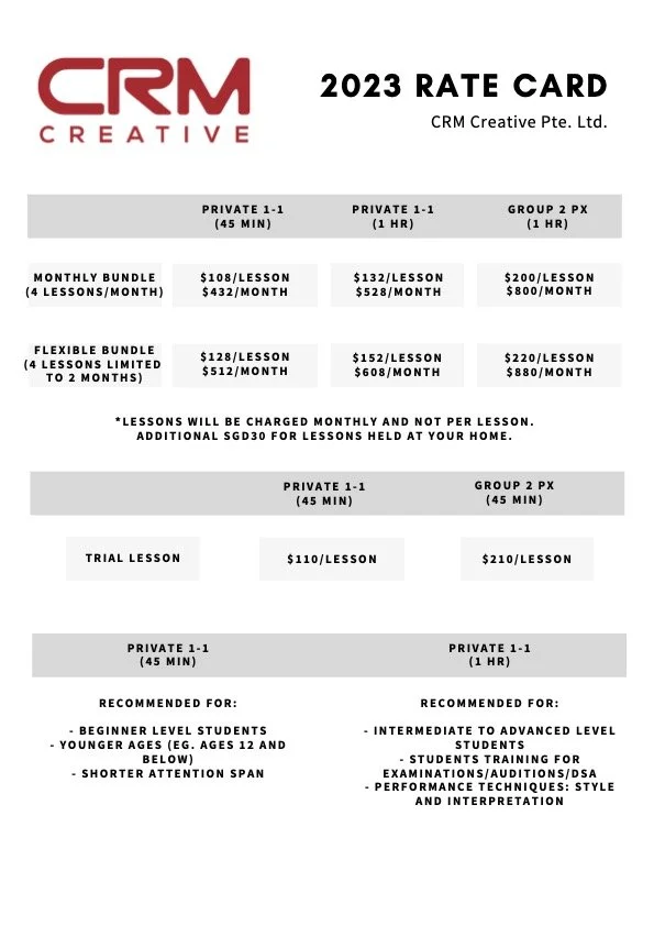 For customized lessons, packages, or for further information, please contact us directly at crmcreativesg@gmail.com or +65 8727 9764 (WhatsApp).